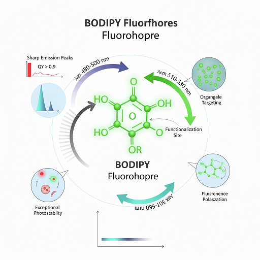 BODIPY (boron-dipyrromethene) dyes constitute a versatile class of fluorophores characterized by sharp emission peaks, high quantum yields, and minimal solvent polarity effects. Their compact, tunable structures span blue to NIR wavelengths with exceptional photostability. The chemically inert core permits functionalization for organelle targeting, ion sensing, and biomolecule conjugation. Their environmental sensitivity and structural rigidity make them particularly valuable for fluorescence polarization, molecular rotors, and energy transfer systems, bridging applications from chemical biology to materials science.