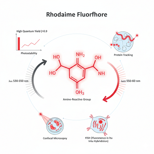 Rhodamine derivatives represent classic red-emitting fluorophores (λem 550-600 nm) with outstanding brightness and photophysical robustness. Their rigid xanthene core ensures high quantum yields (>0.9) and moderate environmental sensitivity. Modern derivatives (e.g., TAMRA, TRITC) feature improved photostability and reduced triplet-state formation. With amine-reactive groups, they serve as premium labels for confocal microscopy, FISH, and protein tracking. Their tunable emission and excellent performance in fixed cells maintain their status as essential tools in core imaging facilities.