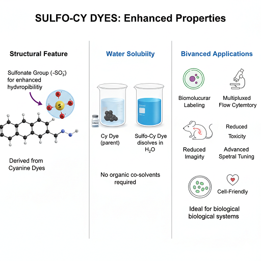 Sulfo-Cy series fluorescent dyes (e.g., Sulfo-Cy3, Sulfo-Cy5, Sulfo-Cy7, etc.) are sulfonated derivatives of cyanine (Cy) dyes, offering enhanced water solubility and excellent biocompatibility. They are widely used in applications such as biomolecular labeling, immunofluorescence, flow cytometry, and in vivo imaging. Sulfo-Cy dyes incorporate sulfonate groups (–SO₃⁻) into the Cy dye structure, significantly improving their solubility in aqueous solutions. They can be directly dissolved in buffers or water without requiring organic co-solvents (e.g., DMSO), simplifying experimental procedures and minimizing toxicity to biological samples