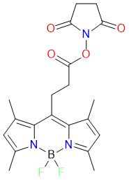 BODIPY 493/503 NHS ester is the most common reagent for conjugating this dye to proteins or antibodies. The NHS ester labels primary amines (R-NH2) on proteins, amine-modified oligonucleotides, and other amine-containing molecules. The resulting BODIPY 493/503 conjugates exhibit bright fluorescence, narrow emission bandwidth, and relatively long excited-state lifetime, making them suitable for fluorescence polarization assays and two-photon excitation (TPE) microscopy. Excitation/Emission (nm) = 496/508.