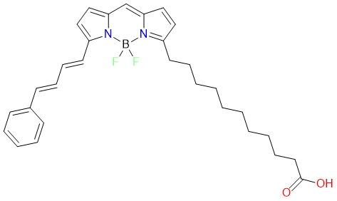 Biological Activity: BODIPY 581/591 C11 is an oxidation-sensitive fluorescent fatty acid analog. It initially emits red fluorescence; upon incorporation into lipids and subsequent peroxidation, its emission shifts to green. It is commonly used to study lipid peroxidation and antioxidant capacity in live cells, particularly in ferroptosis research and fluorescence imaging. Excitation/Emission (nm) = 581/591. References: 1. CDK7-YAP-LDHD axis promotes D-lactate elimination and ferroptosis defense to support cancer stem cell-like properties | Signal Transduct Target Ther. | 2023 Aug 16 | PMID: 37582812 2. Endoplasmic reticulum-targeted biomimetic nanoparticles induce apoptosis and ferroptosis by regulating endoplasmic reticulum function in colon cancer | J Control Release. | 2024 Nov | PMID: 39278355 3. Topology regulation of nanomedicine for autophagy-augmented ferroptosis and cancer immunotherapy | Sci Bull (Beijing). | 2023 Jan 15 | PMID: 36621435