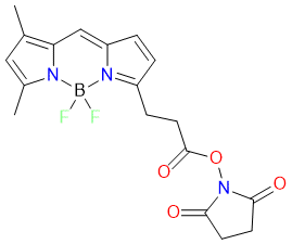 Biological Activity: BODIPY FL NHS ester is an amine-reactive fluorescent probe used to label antibodies, proteins, peptides, and nucleic acids. Excitation/Emission (nm) = 502/511. References: 1. Synthesis and Biological Characterization of a New Norbormide Derived Bodipy FL-Conjugated Fluorescent Probe for Cell Imaging | Front Pharmacol. | 2018 Sep 25 | PMID: 30319407 2. Quenched BODIPY dye-labeled casein substrates for the assay of protease activity by direct fluorescence measurement | Anal Biochem. | 1997 Sep 5| PMID: 9299009 3. Synthesis, Activity, and Application of Fluorescent Analogs of [D1G, Δ14Q]LvIC Targeting α6β4 Nicotinic Acetylcholine Receptor | Bioconjug Chem. | 2023 Dec 20 | PMID: 37748043