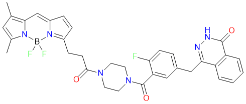Biological Activity: PARPi-FL is a highly selective probe used as an imaging agent for in vivo detection of glioblastoma. Excitation/Emission (nm) = 507/525. Reference: Poly(ADP-ribose) polymerase inhibitors in prostate cancer: a cornerstone in precision oncology | Pharmacogenomics | 2021