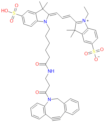 Sulfo-Cy3 DBCO is an orange-red fluorescent dye with fast reaction kinetics and high stability, compatible with standard fluorescence instruments. It contains a DBCO (dibenzocyclooctyne) group that undergoes copper-free click chemistry with azide-containing molecules to form stable covalent bonds, offering rapid and highly selective conjugation. Ex/Em(nm)=555/580. Reference: Noncanonical amino acids as doubly bio-orthogonal handles for one-pot preparation of protein multiconjugates | Nat Commun | 2023 Feb 21 | PMID: 36810592