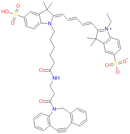 Sulfo-Cy5 DBCO contains both a DBCO (dibenzocyclooctyne) group and a sulfonated Cy5 fluorophore. The DBCO group enables copper-free click chemistry with azide-containing compounds—fast, mild, and biocompatible. The sulfonation confers excellent water solubility, and the compound emits far-red fluorescence under fluorescence microscopy. Ex/Em(nm)=647/668.
