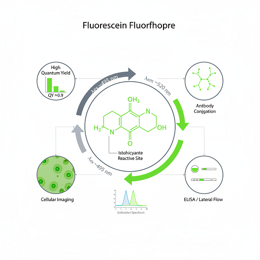 作为基本的绿光发射荧光团(激发/发射波长 ~495/520 nm),荧光素衍生物仍然是生物检测的基石工具。其高水溶性、高量子产率(~0.9)和明确的化学特性使其成为标准化应用的理想选择。具有反应性基团(异硫氰酸酯、NHS酯),可轻松与抗体和寡核苷酸偶联。虽然对光漂白较为敏感,但其成本效益和稳定性能在细胞成像、ELISA、免疫组织化学和侧向层析试纸条等对极端光稳定性要求不高的应用中保持广泛使用。